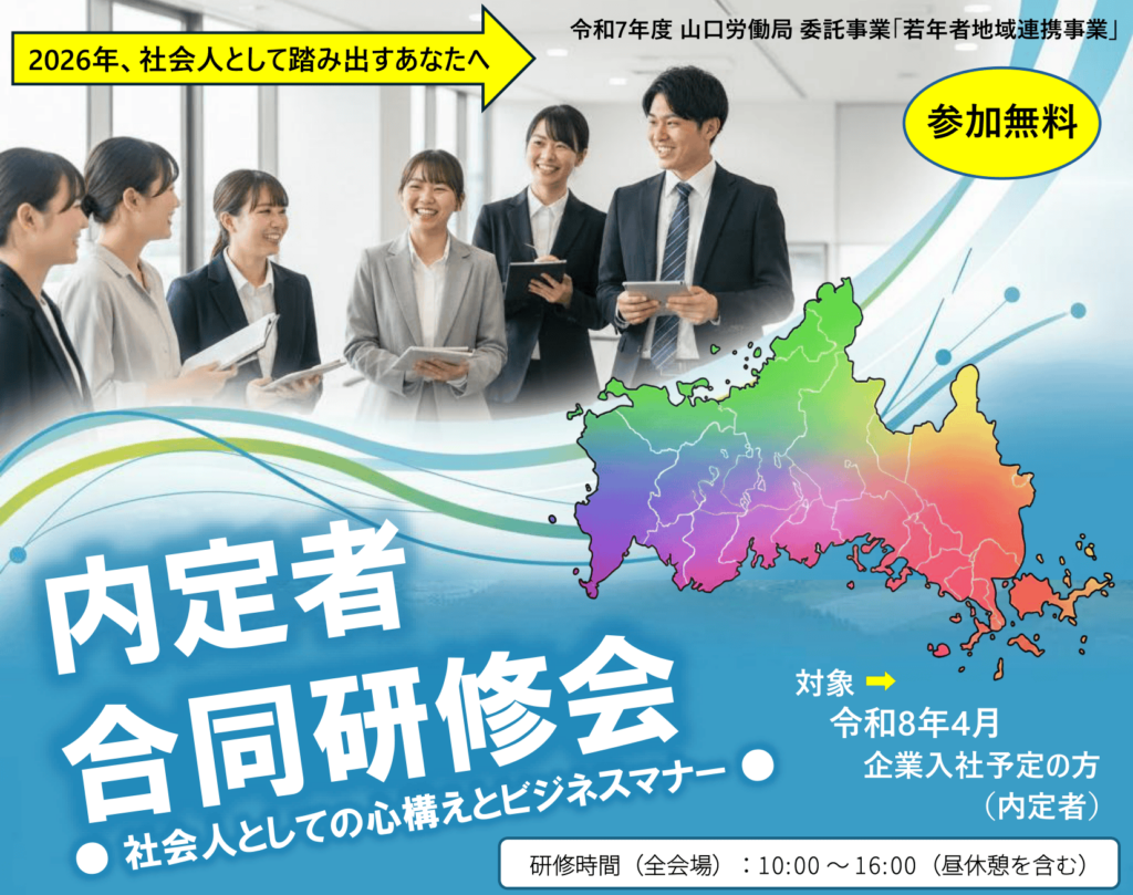 〜同期の輪を広げ、自信を持って社会人デビューを!〜 4月から山口県内の企業で社会人生活をスタートさせる皆様を対象に、「内定者合同研修会」を開催いたします。「社会人としてうまくやっていけるかな?」「ビジネスマナーって難しい?」そんな不安を安... -