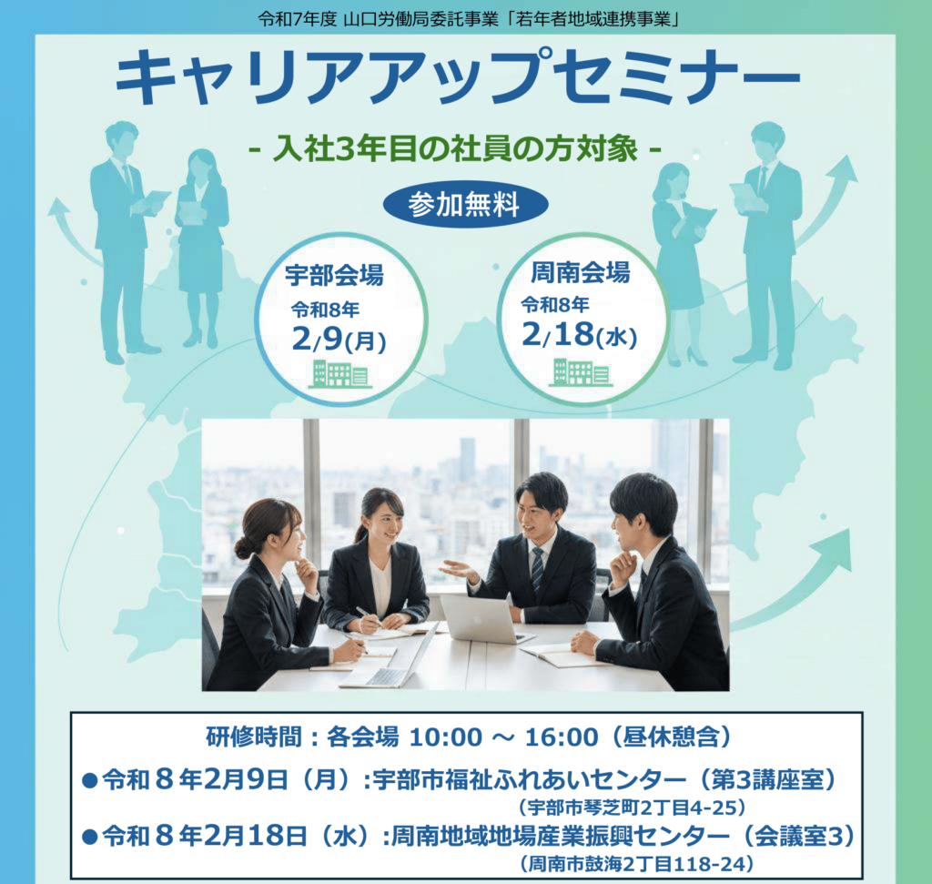 〜未来をデザインする!キャリア自律と成長で、山口から未来へ〜 若手社員としてのターニングポイントとなる「入社3年目」。これまでの経験を振り返り、これからの「自分らしいキャリア」を前向きに描いてみませんか?本セミナーでは、ジョブ・カードを活... -